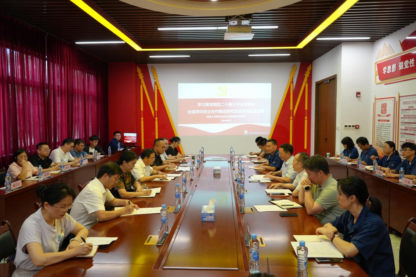 8月22日,为深入学习贯彻党的二十届三中全会精神,进一步落实《江西铜业集团有限公司—南昌大学战略合作协议》,南昌大学研究生院(党委研究生工作部、卓越工程师学院)与江西铜业集团铜箔公司以“学习贯彻党的二十届三中全会精神,全面深化校企合作推动研究生教育高质量发展”为主题开展党支部联学活动。江铜集团党委委员、副总经理廖新庚参加活动并主持联学会议,南昌大学党委常委、副校长涂宗财参加活动并在联学会议上讲话。江铜集团党委组织部、人力资源部有关领导、铜箔公司第三党支部全体党员、南昌大学机关党委第十三支部全体党员、研究生院(党委研究生工作部、卓越工程师学院)其他处级干部参加活动。