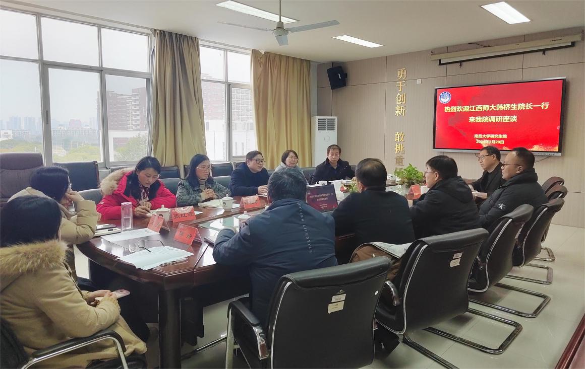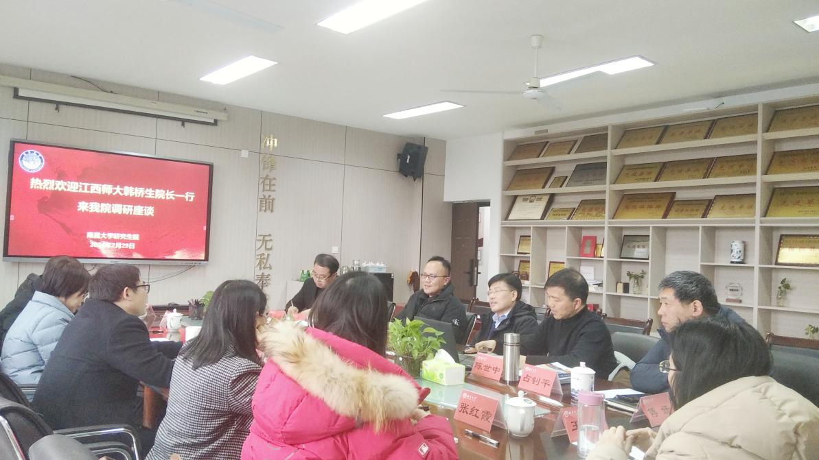 2月29日,江西师范大学研究生院牵头负责人韩桥生一行来我院调研并召开交流座谈会。南昌大学研究生院常务副院长黄伟主持座谈会,党委研工部部长徐亮出席会议,两院相关部门负责人参加座谈。