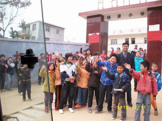 研究生院教职工与杨源小学部分师生在第三期援建的新校门前合影