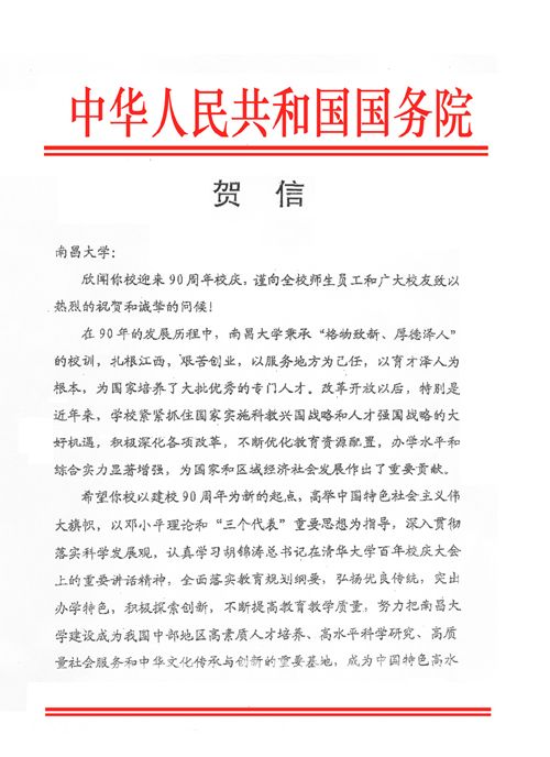 希望你校以建校90周年为新的起点,高举中国特色社会主义伟大旗帜,以邓小平理论和“三个代表”重要思想为指导,深入贯彻落实科学发展观,认真学习胡锦涛总书记在清华大学百年校庆大会上的重要讲话精神,全面落实教育规划纲要,弘扬优良传统,突出办学特色,积极探索创新,不断提高教育教学质量,努力把南昌大学建设成为我国中部地区高素质人才培养、高水平科学研究、高质量社会服务和中华文化传承与创新的重要基地,成为中国特色高水平现代大学,为促进中部地区的崛起,为建设创新型国家和人力资源强国,为全面建设小康社会和中华民族伟大复兴作出新的贡献,以骄人业绩迎接百年校庆!