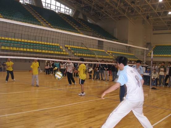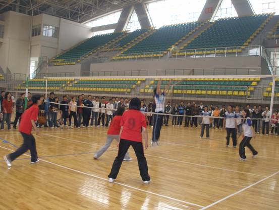 (研究生会 记者团 余敏讯)2009年4月12日下午,“前湖赛场”排球联赛男、女决赛在体育馆进行,研究生院党委副书记饶书记也前往比赛现场为我院运动健儿打气加油,饶书记在比赛过程中还为我院运动员作出了现场指导。下午15时,女子组决赛开战,研究生院vs信工学院,两队的实力相当,比赛打得相当激烈,在前两局我院均以两分的优势(25:23、27:25)取得胜利。第三局,信工学院以25:19扳回一局。但这丝毫没有动摇我院女将们必胜的决心,在随后的第四局中,女将们以25:17轻松地拿下最后一局。最终,研究生院女队以总分3:1的好成绩,取得了本次排球联赛女子组的冠军。