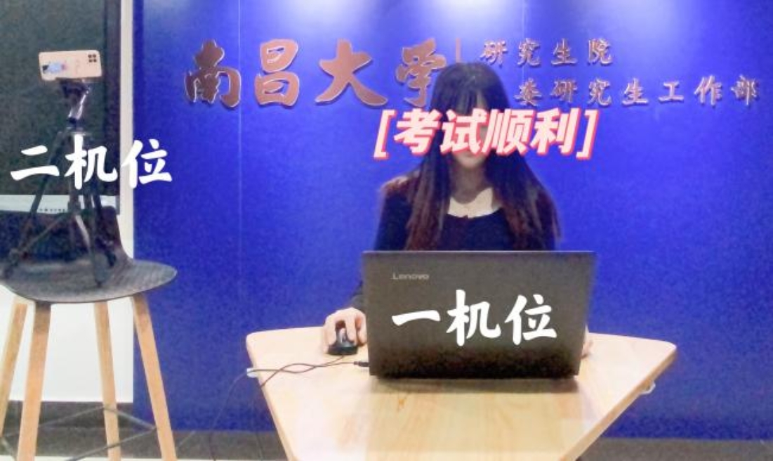 双机位操作:考生双手摆放桌面,第一机位从正面拍摄,放置在距离本人30cm处,完整拍摄到考生双手以上身体部位。第二机位从考生侧后方45°距离本人1m处拍摄,可以拍摄到考生侧面及主设备电脑全屏幕,需保证面试考官能够从第二机位清晰看到第一机位屏幕。如下图所示: